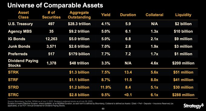 Preferred security with ~9% dividend and potential slim price appreciation (launched at $90 last month, $96.39 currently with desired peg between $99 and $101). Yield will increase 0.25% per month until it is in the desired $99-$101 range. If it ends up exceeding $101, yield will decrease 0.25% per month. The goal of this is targeting the money market/fixed income area of finance. Overcollateralized by the tune of 6.1x (i.e. bitcoin could fall by over 80% and this preferred is still collateralized fully by the assets on MSTR's balance sheet in a liquidation event). For comparison, Investment Grade bonds are usually around the 2.1x collateralization.