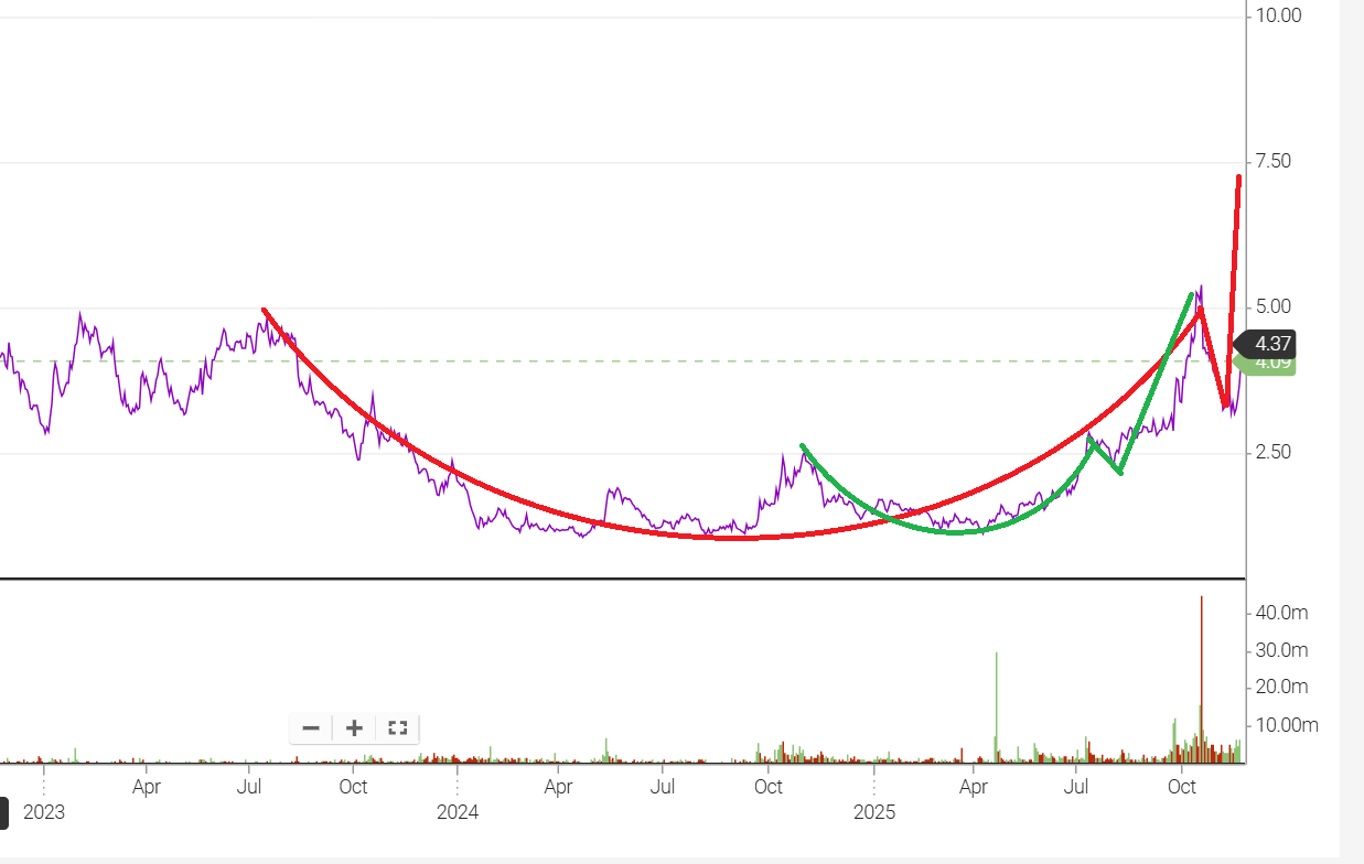 We had the ~52 week cup and handle complete recently. Shown by the green traced line in the picture. We're now working on a 100+ week cup and handle, shown by the red traced line. Target $7.50? That seems like too much to me but the stars and tea leaves like it. This supports Thermo's theory with even more fact based totally legit science