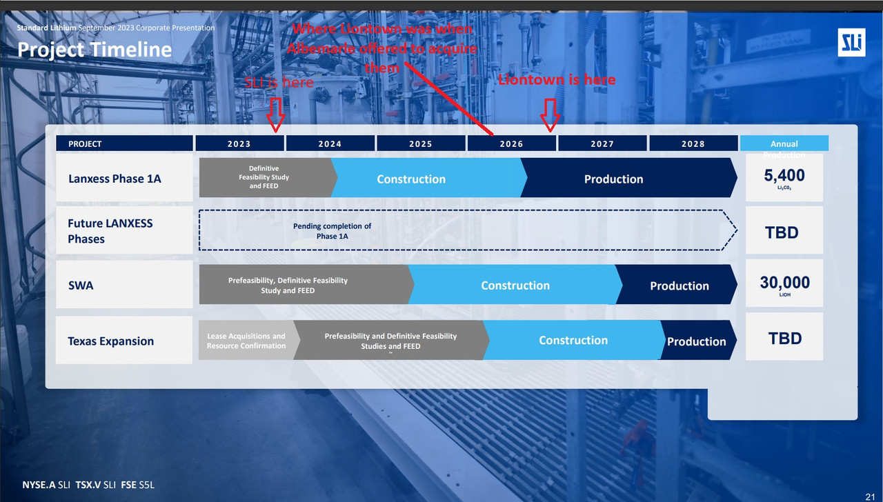 Since Albemarle recently offered to buy Liontown (it fell through), I decided to compare SLI's production timeline with Liontown's for our reference.