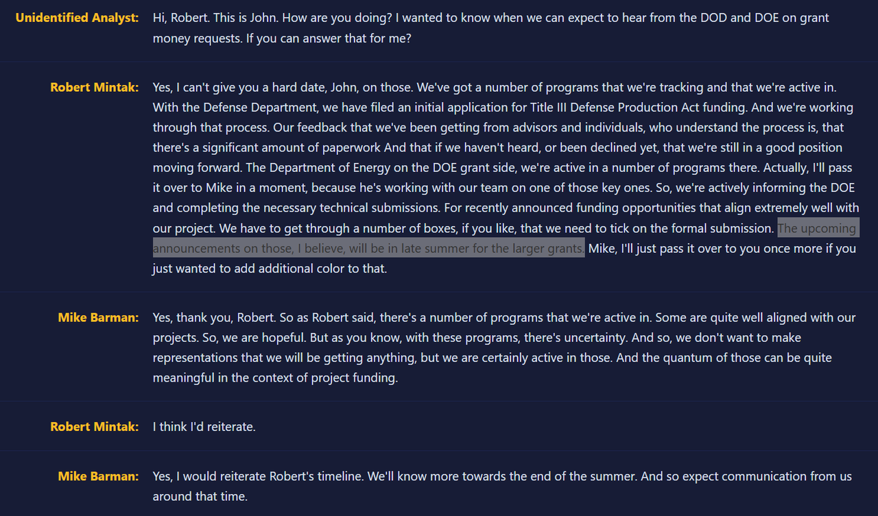 Sounds like we should know by end of summer (pic 1) and that they want to have financing lined up in a way that isn't dependent on grants (pic 2).