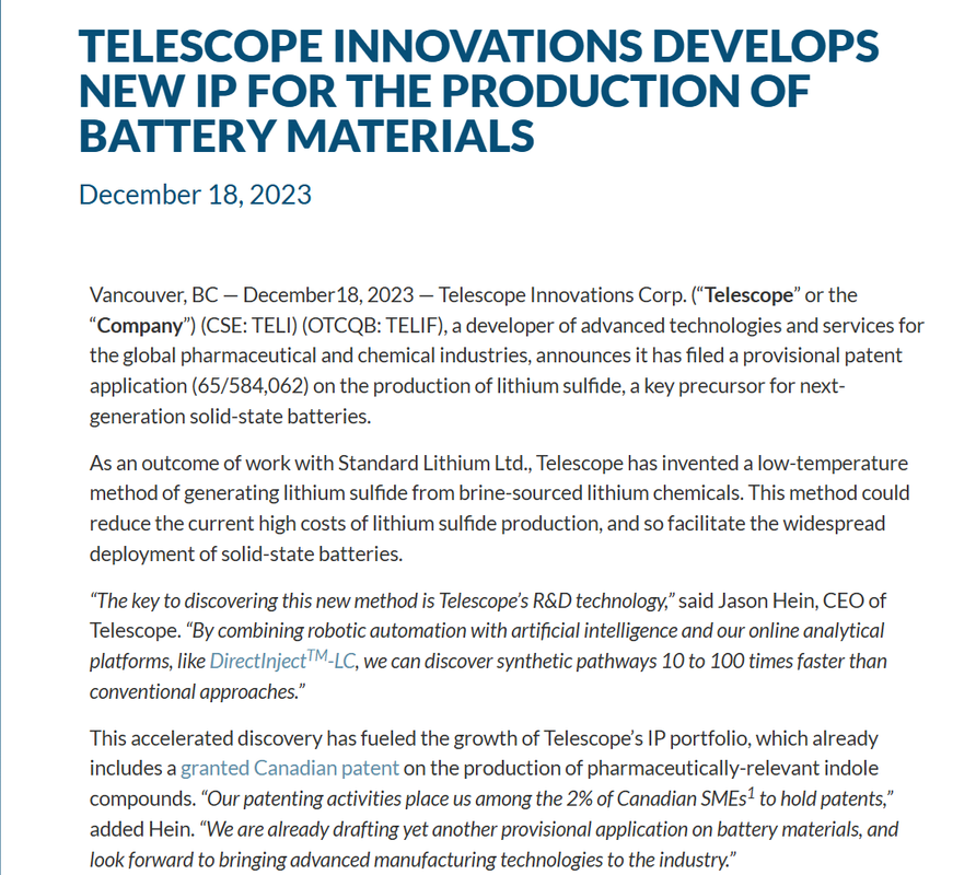 - Telescope Innovations Corp. (CSE: TELI) (OTCQB: TELIF) ("Telescope Innovations" or the "Company"), a leading developer of advanced technologies and services for the global pharmaceutical and chemical industries, announces the successful outcome of a research collaboration with Standard Lithium Ltd. (TSXV: SLI) (NYSE American: SLI) ("Standard Lithium").