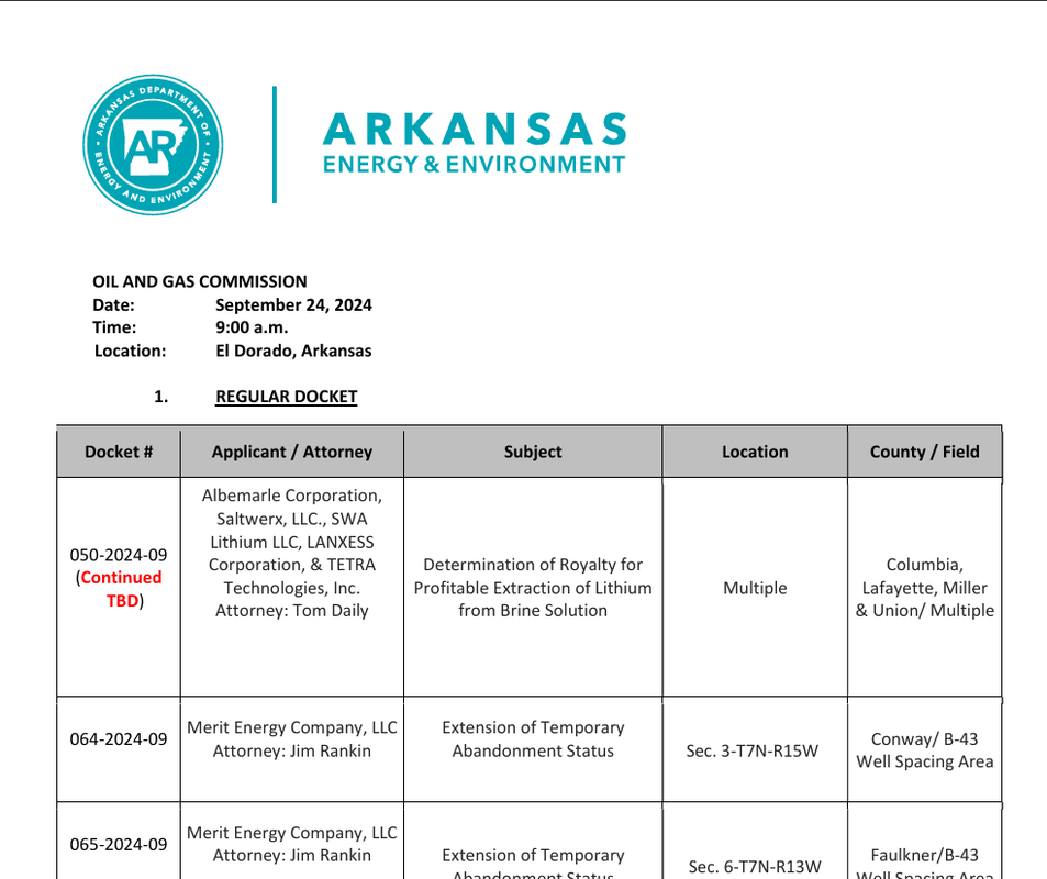 On September 24, 2024, the Arkansas Oil and Gas Commission will hear an Application filed by Albemarle Corporation, Saltwerx LLC, SWA Lithium LLC, LANXESS Corporation, and TETRA Technologies, Inc. (“Applicants”) in Docket No. 050-2024-09. In this docketed matter, the Applicants are seeking a Commission Order approving the method for fairly and equitably accounting to brine mineral interest owners for the anticipated profitable extraction of lithium ions from the Smackover Limestone Brine produced from lands in Columbia, Lafayette, Miller, and Union Counties.
