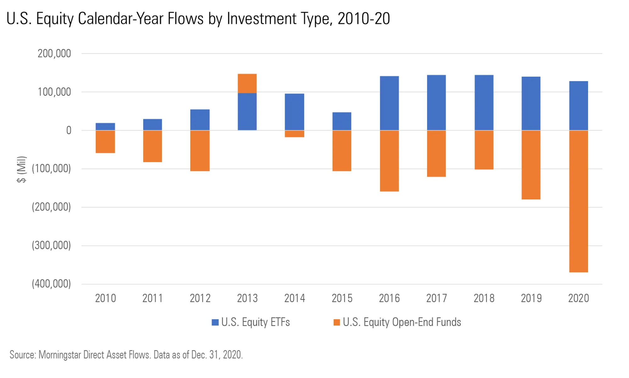 According to The Investment Company Institute, net equity ETF and MF fund flows are negative over the past 5 years - -$142B since May 2017.