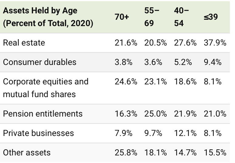 Breaking down that wealth by components is even more eye-opening. The 39 and under age group holds 37.9% of their assets in real estate, the largest share amongst any age group (and concentrated in the hands of fewer people) while older age groups have their wealth spread out across real estate, equities, and pensions.