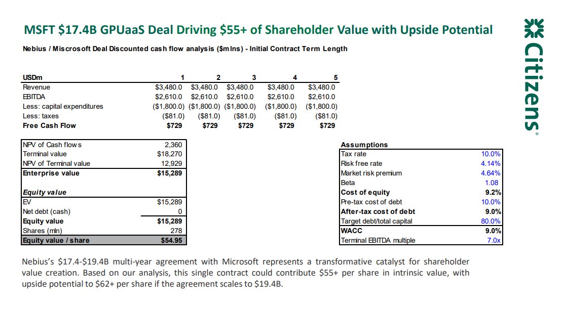Nebius's $17.4-$19.4B multi-year agreement with Microsoft represents a transformative catalyst for shareholder value creation. Based on our analysis, this single contract could contribute $55+ per share in intrinsic value, with upside potential to $62+ per share if the agreement scales to $19.4B.
