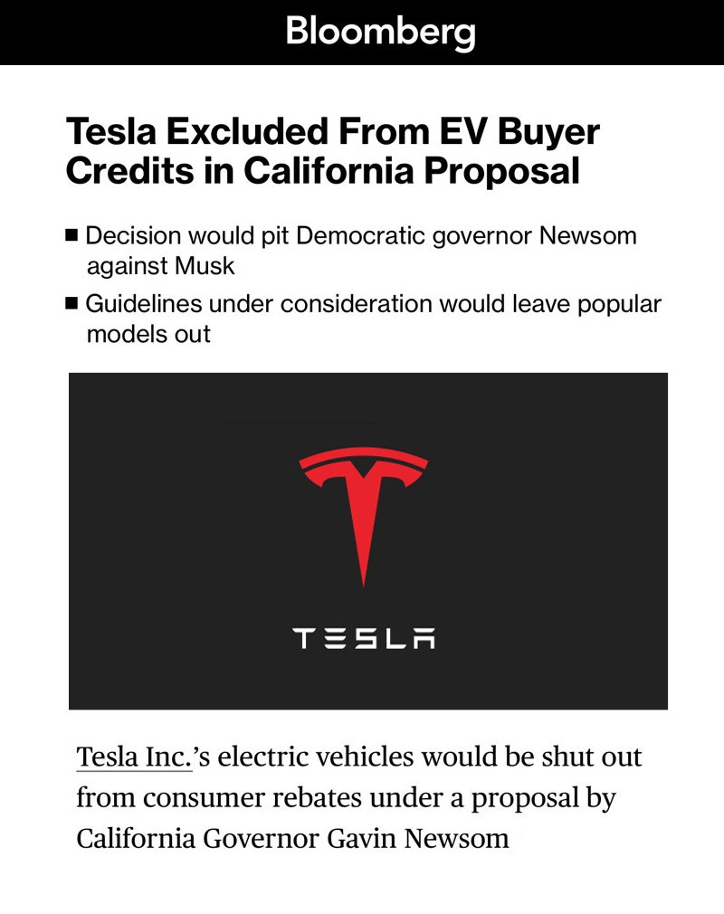 Proposed California Bill would exclude TSLA from EV Buyer Credits.
