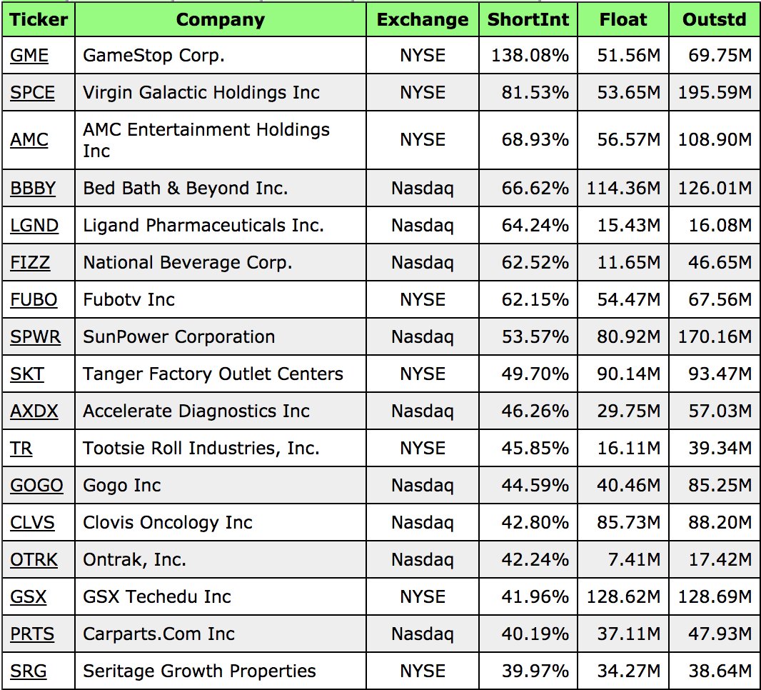 Virgin galactic is interesting. Short shares far exceed the float with a stock that has a solid future