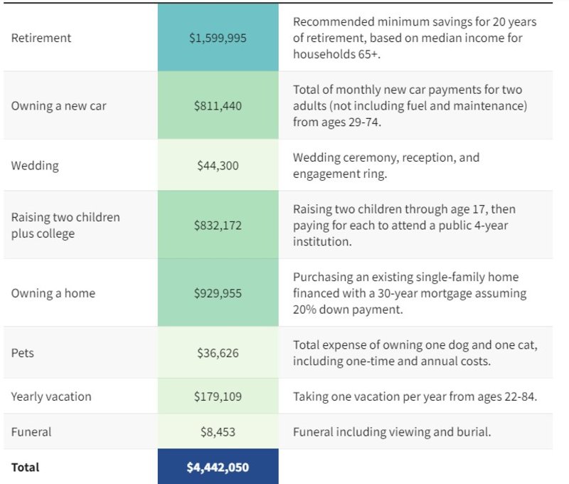 The American Dream now costs $4.4 million—that’s the estimated lifetime household cost of common milestones, including getting married, raising two children, buying a home, having new cars, saving for retirement, going on yearly vacations, and more.