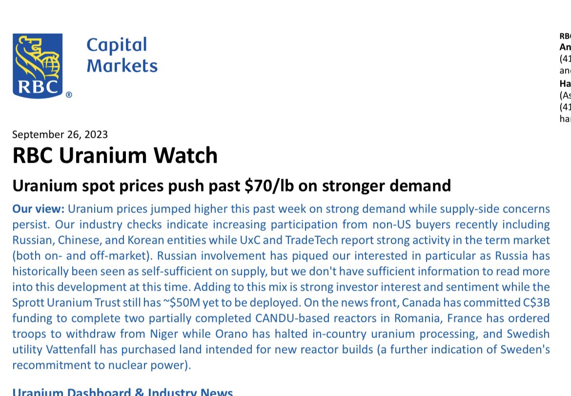 Apparently Rosatom has put in a market request for U308... Wow. Spot price clear break through $70 and SPUT with more than $50 mil in waiting to purchase. If the broader market drags this thing down I may be freeing up some cash to buy. The fundamentals are impossible to ignore at this point.
