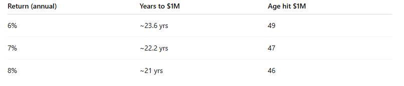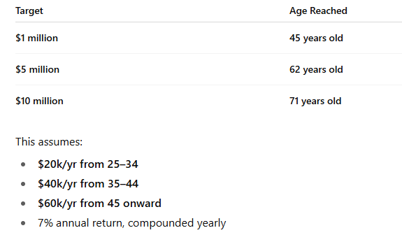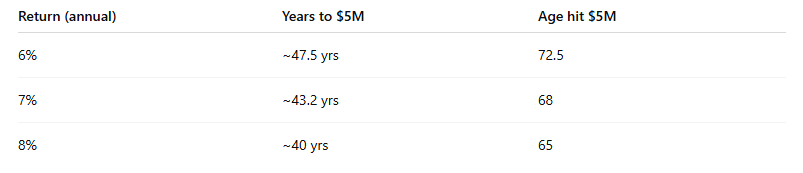 Hitting 8 digits in 60s would be top end, but not impossible in anyway. Any inheritance ($100,000+) along the way can shave off 1-5 years of this time frame.