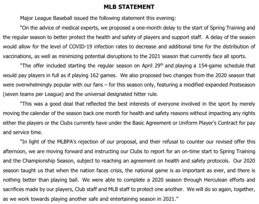 MLB on Friday proposed to the union a 154-game schedule with full pay, delayed by a month and extended by a week, sources say. Also, with expanded postseason. Union considering.