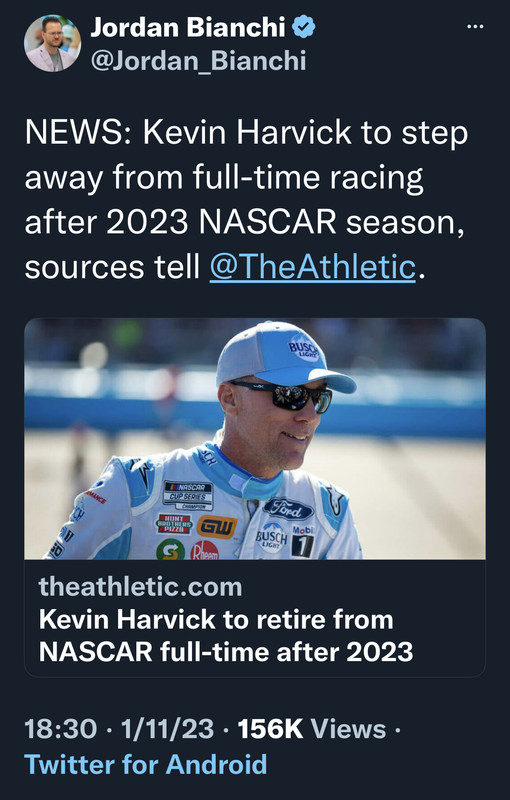 Wow. Sad to see Harvick go. Not that I’m a huge fan of his, but now there are very few drivers from the Gen 4 days left.