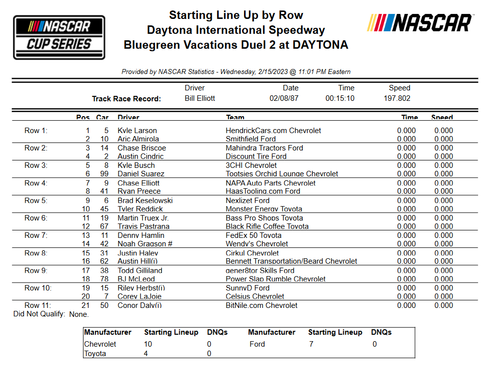 Another all Hendrick front row for the Daytona 500. Bowman on pole, Larson 2nd.