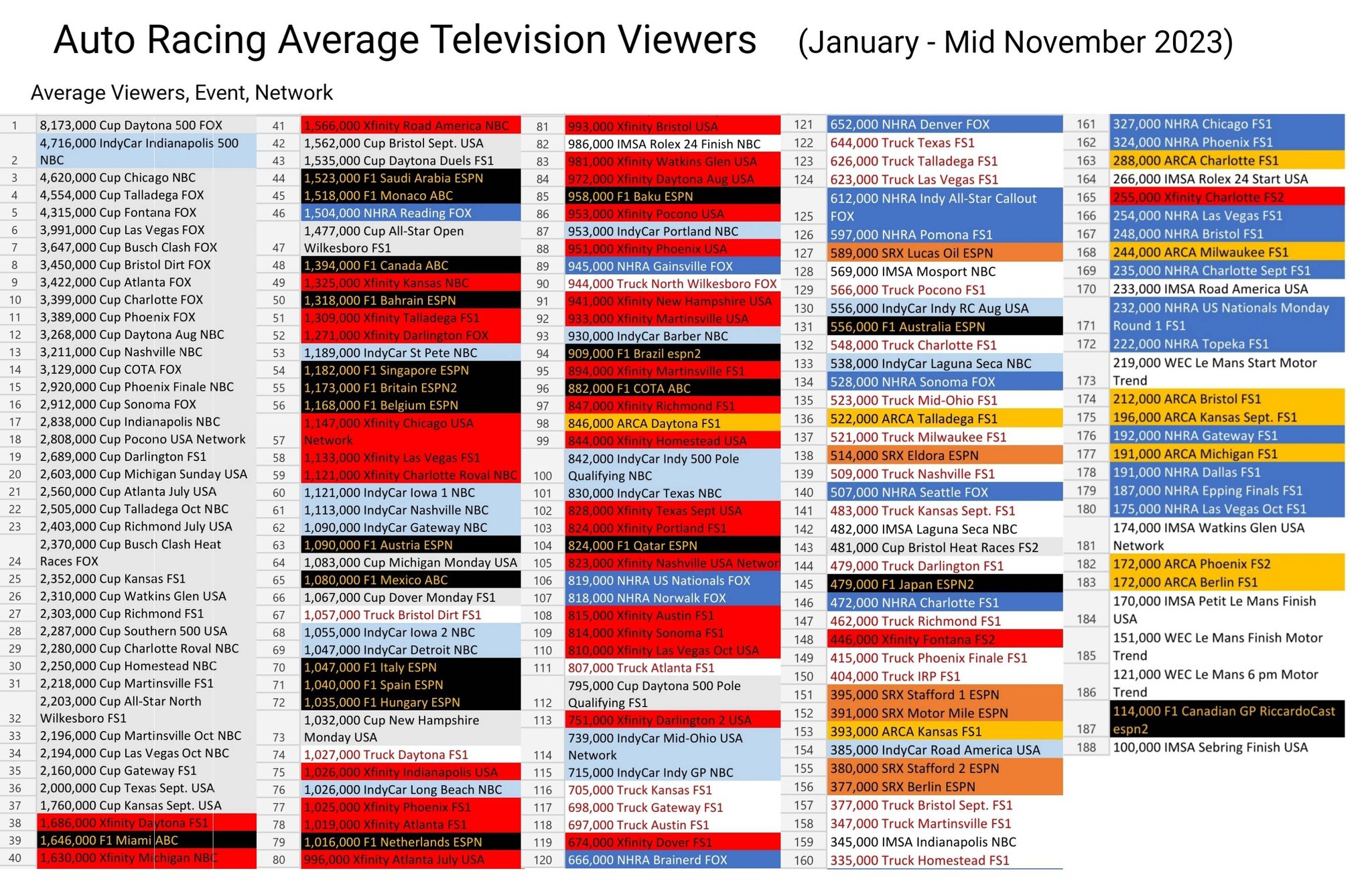 2. I am surprised to see the Fontana race get such high numbers and just makes me even more mad that they are tearing that track down. Maybe the nostalgic element played into the high numbers this year (and the track itself had good attendance this year), but I really enjoyed going to that track and watching the races there. Tearing it down for a short track (if they build it at all), no thanks IMO.