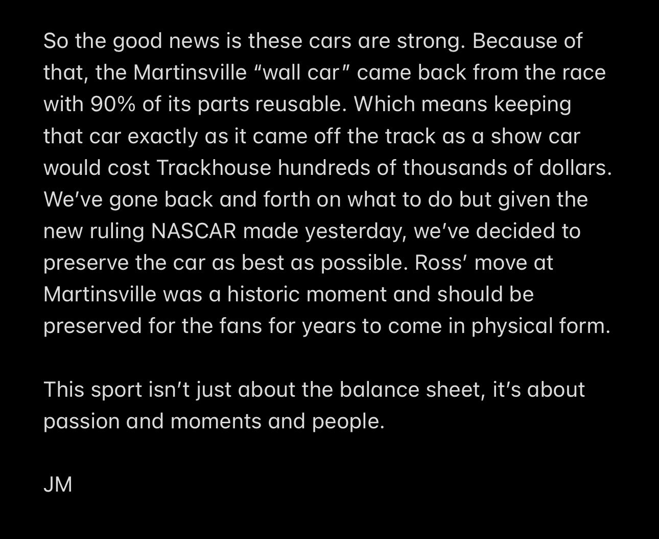 Yes he is. If they can somehow put it in a showroom where fans pay $5 to see it then can make their money back. Or if one of their drivers has 1 less wreck this year like in D500, then they save that amount of money (tell Ross to stat away from Denny this year lol).
