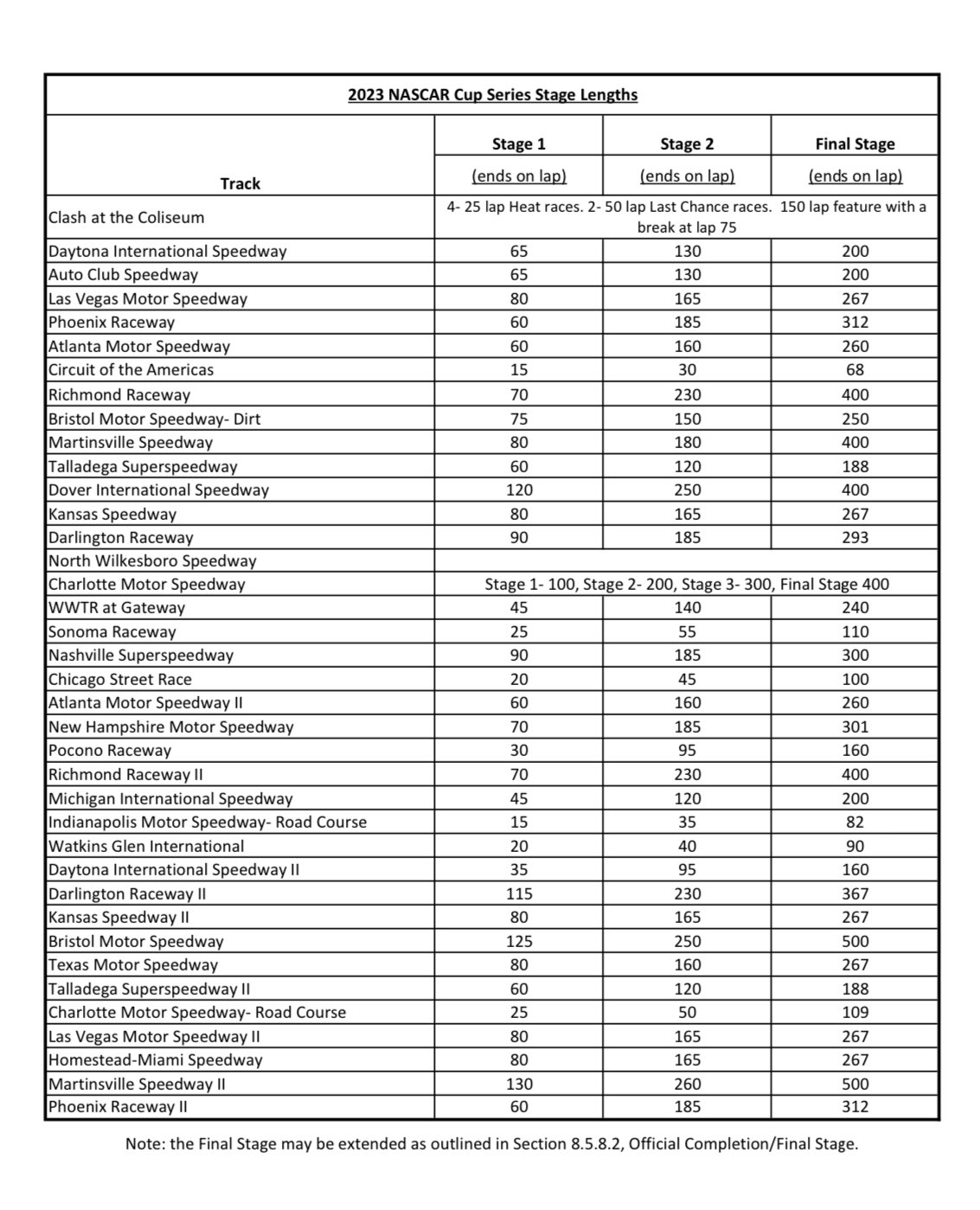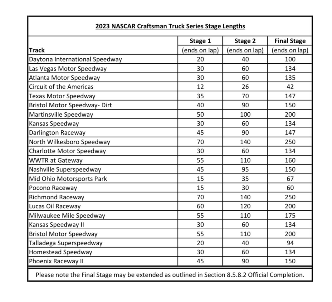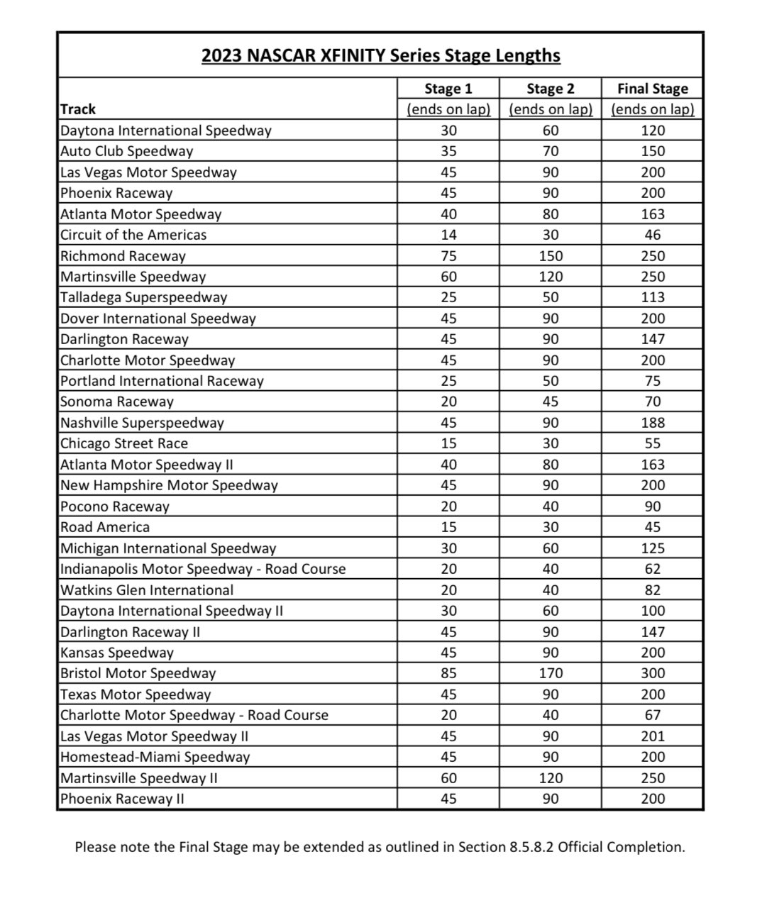 NASCAR has released race stage lengths for the 2023 season for all three national series.