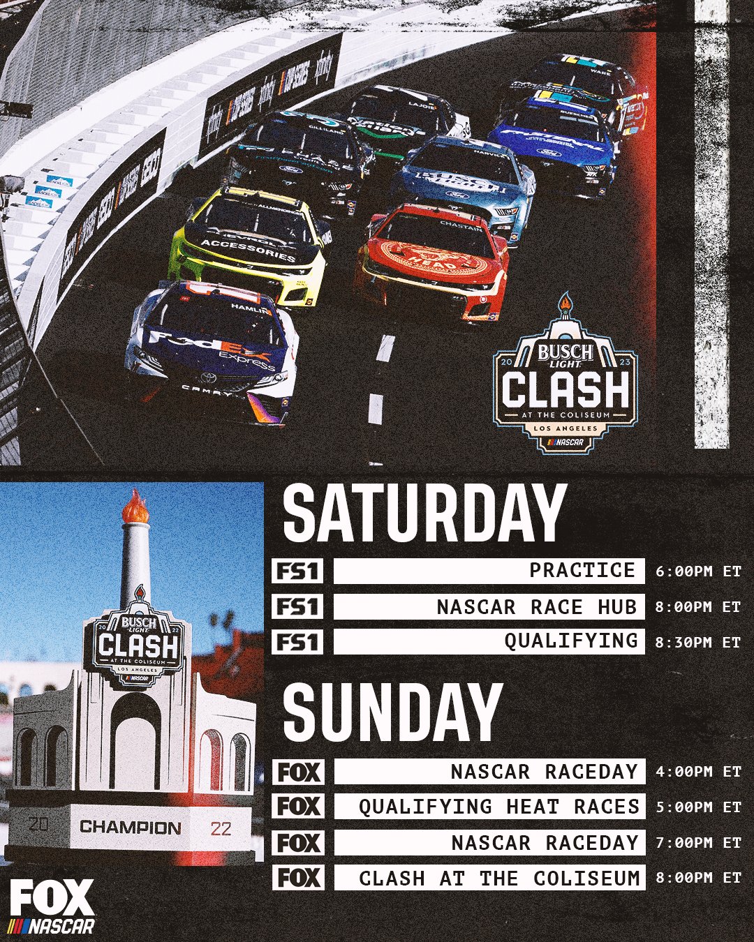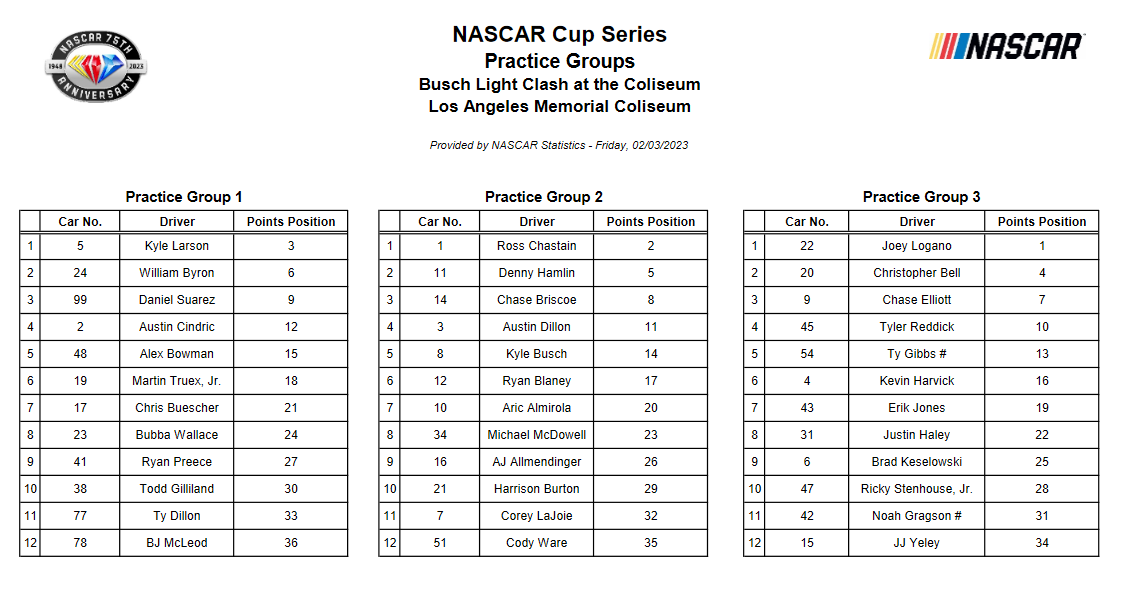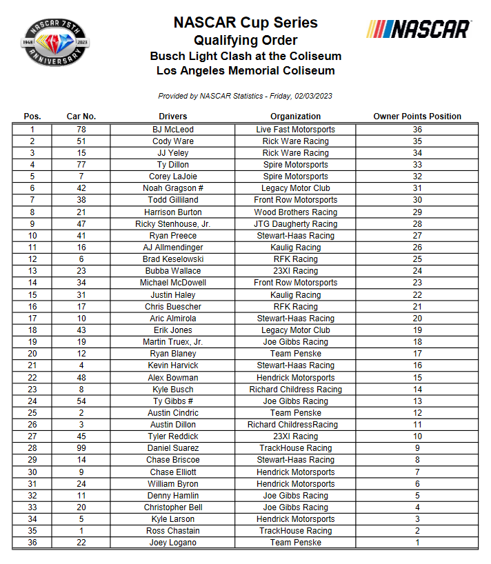 Clash main event will have 27 cars. Top five from each of four nine-car heats (25 laps each heat), then top-three from each of the two 50-lap last-chance qualifiers and one points provisional. Main event 150 laps. Only green-flag laps count in all heats/LCQ/main event.