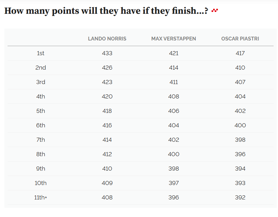 All Norris has to do is get a podium to be champion. He still has the fastest car so unless McLaren screws up the strategy again he’s probably winning it. The fact that Max even has a realistic shot at the championship at the last race is incredible.