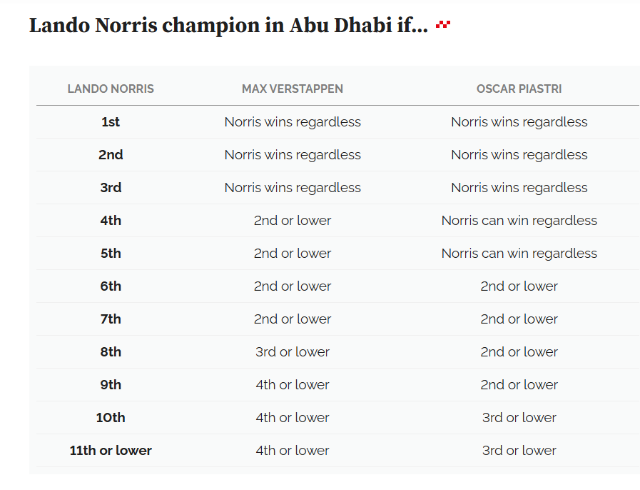 All Norris has to do is get a podium to be champion. He still has the fastest car so unless McLaren screws up the strategy again he’s probably winning it. The fact that Max even has a realistic shot at the championship at the last race is incredible.