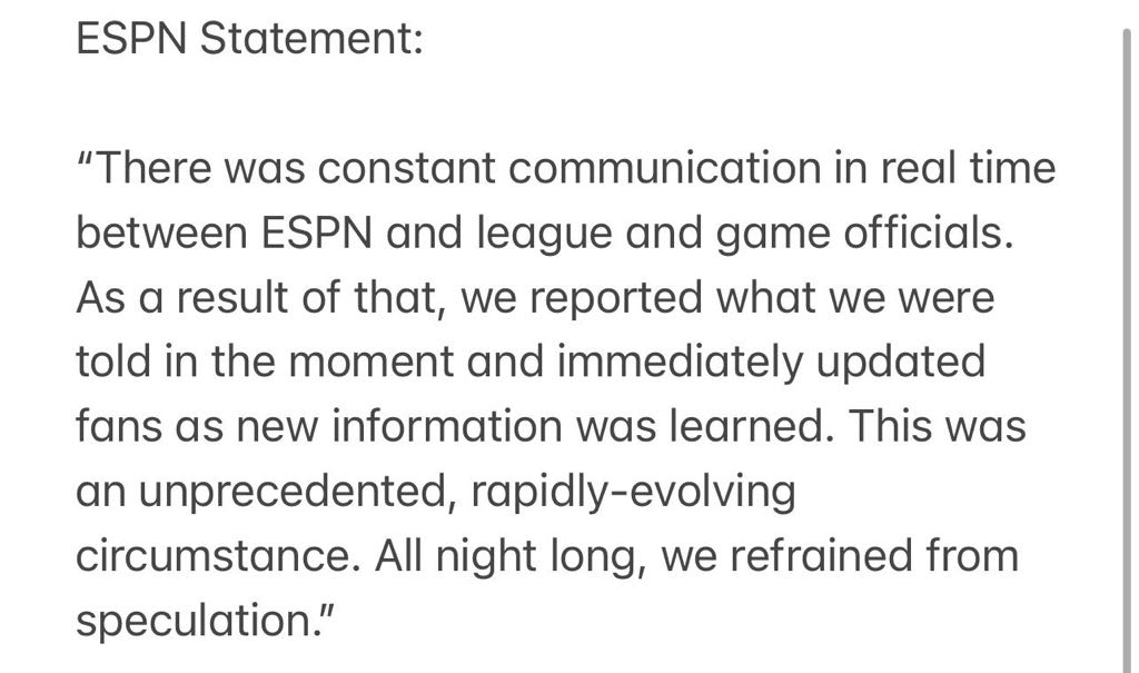 ESPN saying they refrained from speculation all night is such a crock of shite. All they’ve been doing since then is speculating because there’s only been like 5 unique pieces of actual information to come out since he went down.