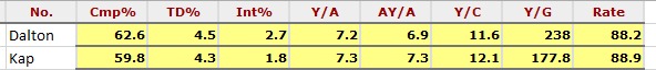 I'll take YPA over passing yards per game, personally though. But yes, they are similar from a career standpoint. Dalton had 1 great year, and he had an absurd Oline where he was never touched and took advantage of that. If you factor in Oline play and give each an Oline that isn't that dominant, I'd absolutely take Kaep over Dalton.