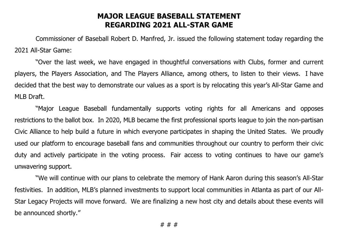 BREAKING NEWS: MLB is moving the All-Star Game and draft out of Atlanta this year. Just announced.