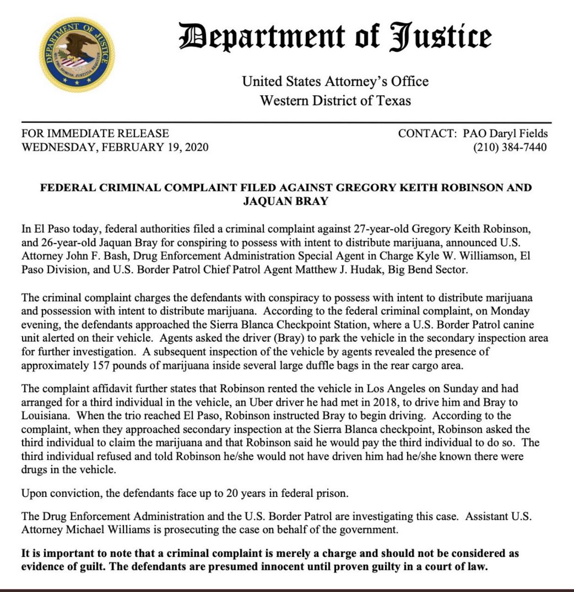 A third person in the SUV was not charged, though Robinson and Bray attempted to get the person to claim responsibility for the weed, per TMZ.