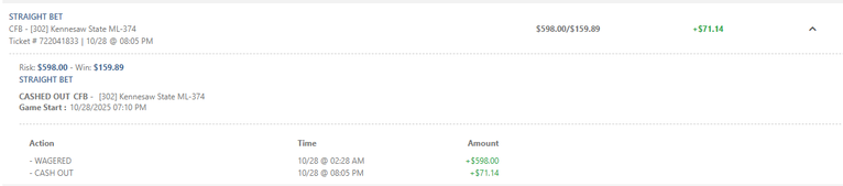I hammered the Kennesaw ML looking for that tasty -375 payout