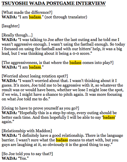 Then Tsuyoshi Wada starts his presser by declaring himself a "bad arse." Maddon told him to say it. Must have said it like 5 times