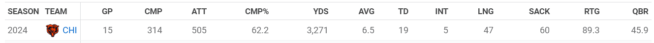The bears were 7-10 last year with a guy who averaged 150 pass yards a game and have gotten worse with Caleb Williams.