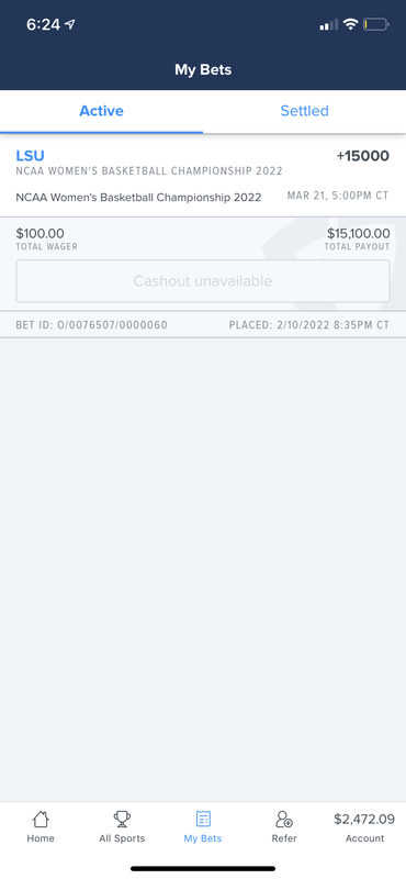 Correct. Im not some sort of betting guru like someone made it out like I tried to paint myself as. It was a drunken $100 after being like “why is LSU such long odds as a top 20 team.” Im MORE than happy to turn $100 to $600 and get out of it even before potentially having to put $$$ onto FanDuel to hedge LSU opponents as favorites.