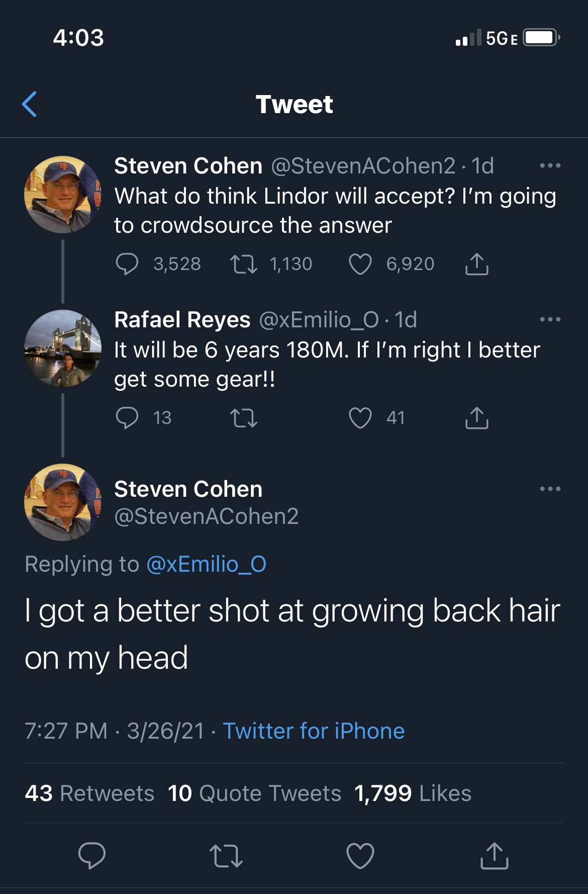 Meanwhile the Mets owner thinks 6/$180 for Lindor is a laughable number. Not gonna be surprised if he gets a deal done this week and sets the market. O/U $300 million is the question