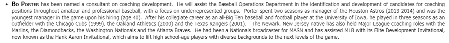 More on what Bo Porter will do in his new role with MLB (from league release):