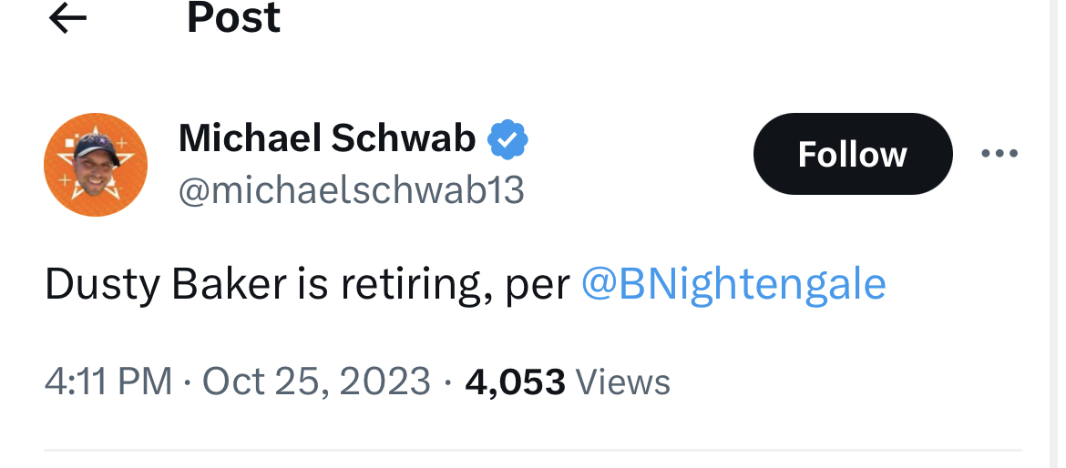 We’d like 24 hours to enjoy the departure of Dusty Baker before we all start fretting about which Bagwell puppet gets hired to manage this club.