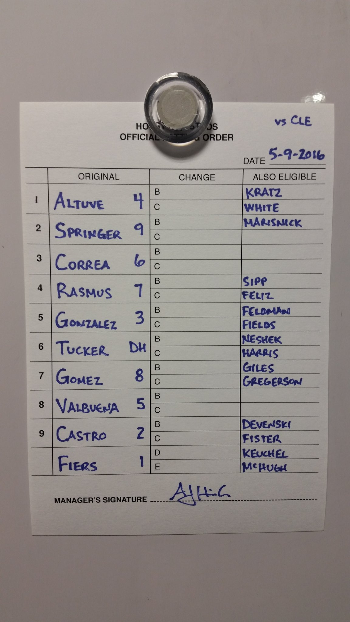 Gattis is catching for the Hooks tonight.