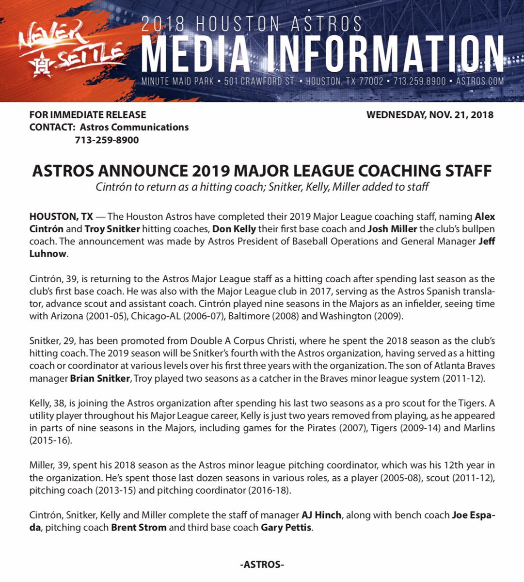 Back to Houston, which has been shopping near the top of the market for free-agent outfielders, according to Olney, who lists A.J. Pollock, Andrew McCutchen and Michael Brantley among their targets.