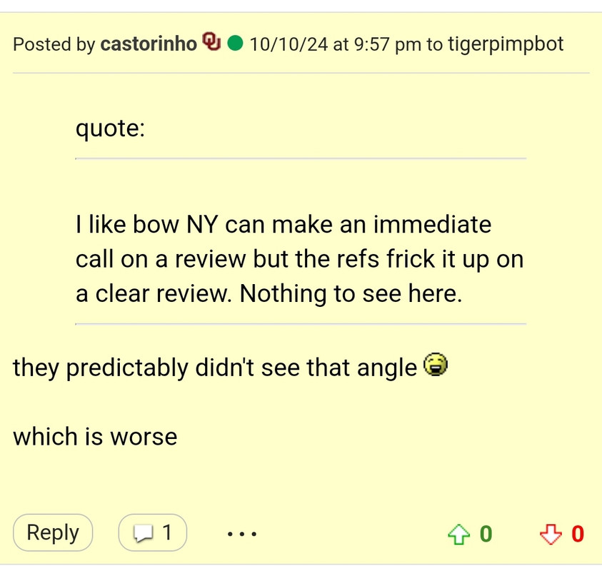 quote:in a fairly recent game (within the past three weeks) the ref guy in the booth literally said "but they don't have this angle for replay" and I thought that was fricking wild.
