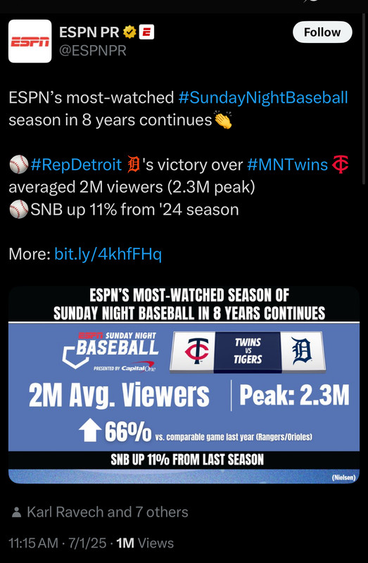 Fair enough. Maybe baseball fans have started coming back. If it’s working, then don’t change anything. I just remember viewership and attendance struggling some years ago.
