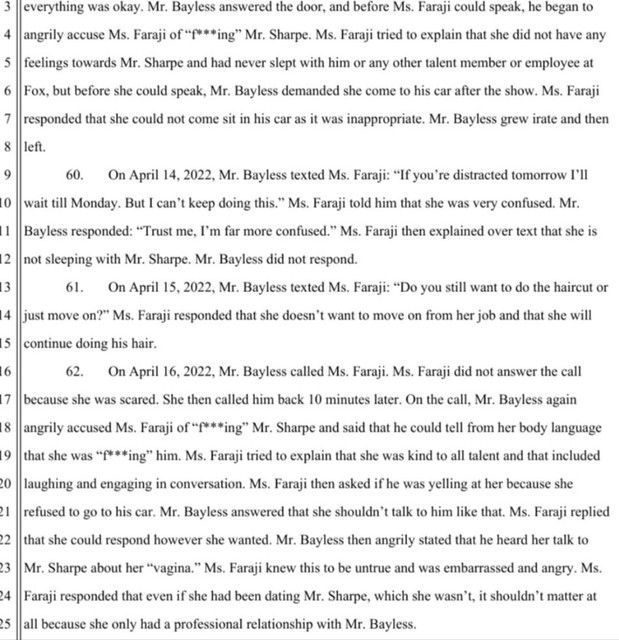 Bayless became more aggressive over the years, according to the suit. He allegedly offered Faraji $1.5 million to have sex with him