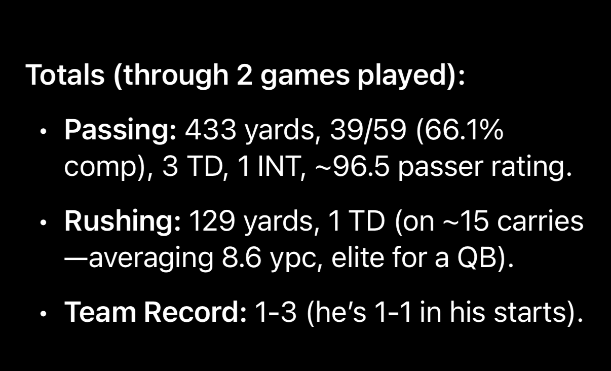 Still decent but has been passed by Caleb Williams for who is the better QB.