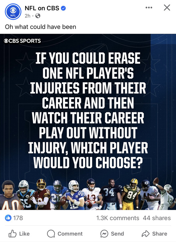 I saw this on facebook and thought it would be an interesting topic. If you could erase all the injuries suffered by one NFL player over their entire NFL career, who would it be?