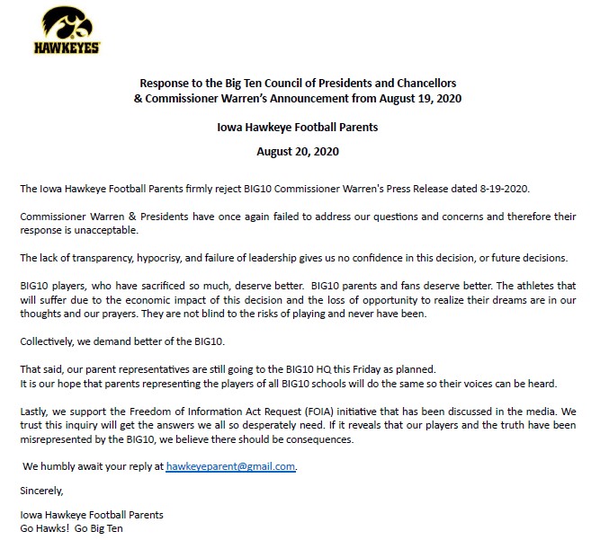 Iowa parents "firmly reject" the contents of @bigten Kevin Warren's news release and plan to head to Rosemont, Ill., Friday.