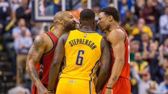 Indiana's 108-90 home victory over Toronto on Tuesday night was marred by a heated confrontation between the Pacers' Lance Stephenson and the Raptors' DeMar DeRozan with 3.3 seconds remaining in the contest. The shoving match broke out when tempers flared between Stephenson and DeRozan after the Raptors guard took issue with Stephenson's layup at the end of the Pacers' runaway win over their Eastern Conference rivals. Stephenson was faced down by DeRozan and several other Raptors players after he put up the layup just before time expired -- instead of holding on to the ball and walking off the floor -- which seemed to break one of basketball's cardinal rules. The skirmish then spilled down the sideline and into the Pacers' bench, where Toronto's PJ Tucker was still jawing with Pacers players as coaches tried to separate the players. DeRozan told reporters after the tilt that the play was "disrespectful to the game." Tucker called the play "classless'' and "tasteless.''
