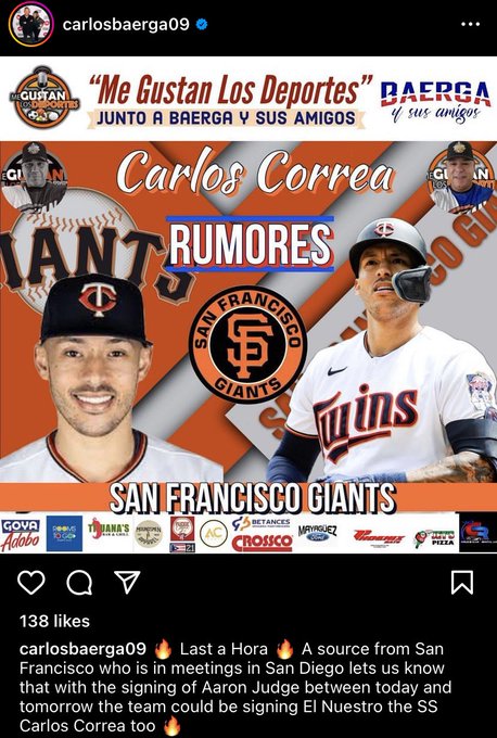 Carlos Baerga is at it again. He says Judge to San Fran and Correa may follow him there.