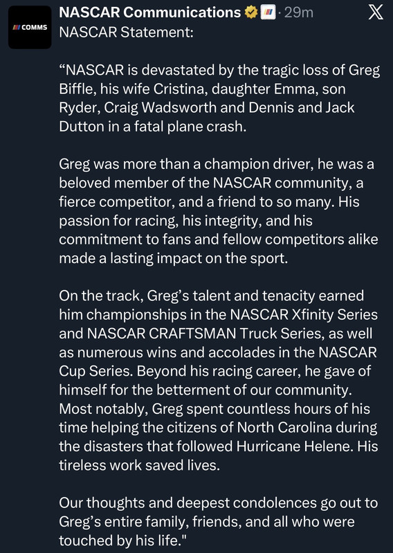 re: Nascar Driver Greg Biffle & family killed in private jet crash