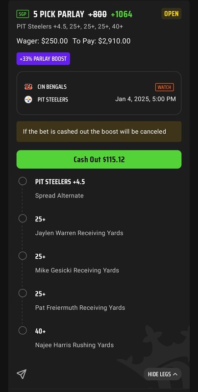 Mates we've cooked up some SGPs for tonight's Bengals / Steelers tilt. Good luck to each and every one of you.