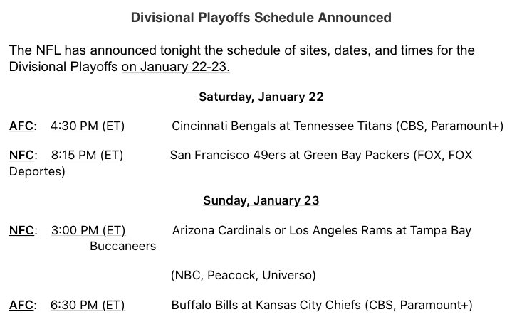 Well, Bengals/Titans and Chiefs/Bills both look like pretty good matchups.