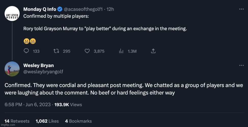 quote:Link? I suggest you to listen to the Wesley Bryan interview. Rory has more support from the players than ever. The meeting yesterday only strengthened that apparently