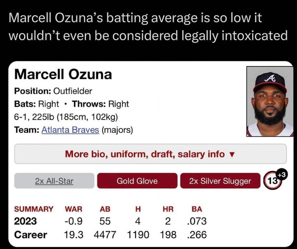 Ozuna has a -1 WAR for the season already in only 55 at bats. Holy shite. It also still cracks me up that he won a Gold Glove. I know he used to be a significantly better defender than he is now (shoulder surgery does seem to have really fricked up his throwing arm), but that is still unreal.