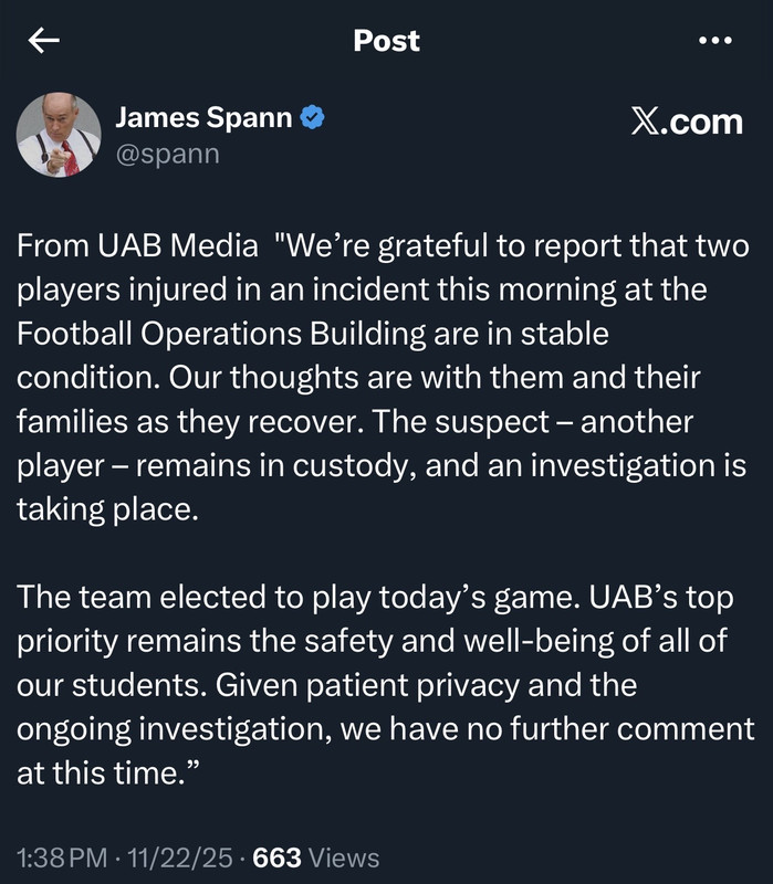 UAB football's team had some kind of fight this morning. Update: Now reports of stabbings.